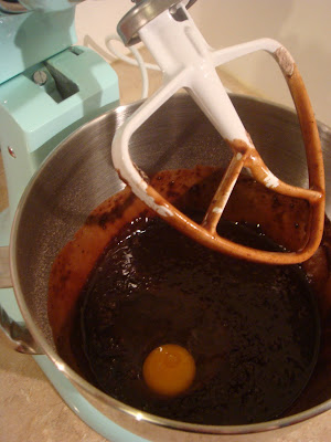 Sift together flours and cocoa, whisk into cooled chocolate mixture. Add the egg and mix until combined.