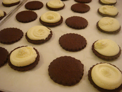 To make the mint choc cookies- Pipe or spread the mint cream onto half of the cookies.